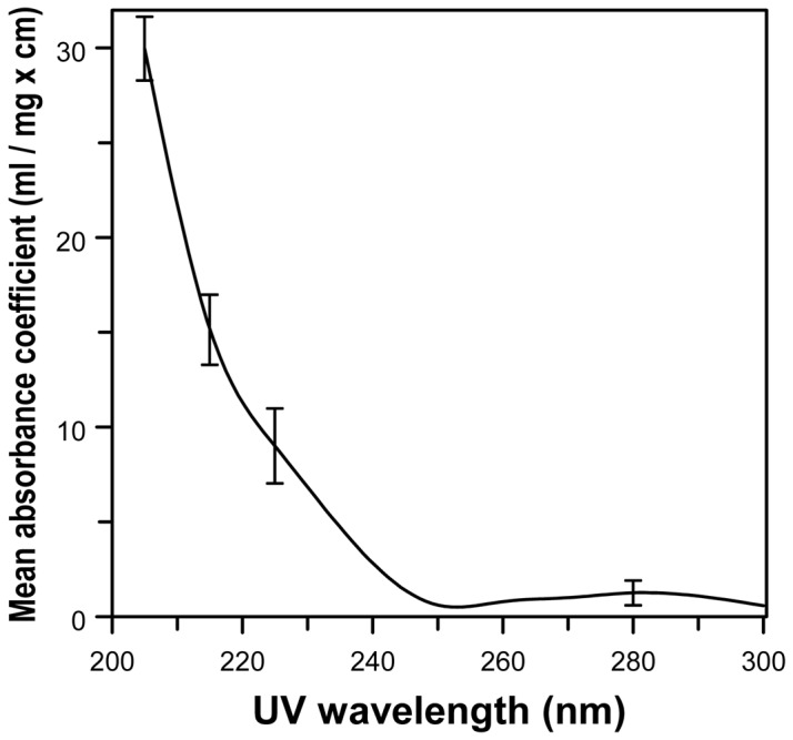 Figure: “Mean wavelength-dependent UV absorbance coefficients, averaged over published measurements for eight common proteins”
