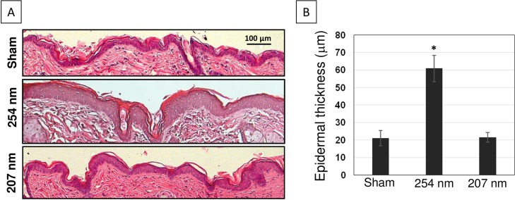 Figure: A.) Representative cross-sectional images of mouse skin. B.) Average epidermal thickness for non-irradiated mice, mice under standard germicidal UVC, and mice under 207 nm UVC.