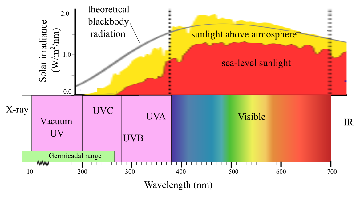 Ultraviolet (UV) light is electromagnetic radiation that is shorter wavelength (higher energy) than visible light and longer wavelength than X-rays. The UV light that can be found on Earth is broken into three subcategories: UVA, closest to visible, (315-380 nm), UVB (315–280 nm), and UVC (280-200 nm). Although the sun emits light in all three UV categories, as well as visible and infrared (IR), not all the light reaches us on the surface. UVC is absorbed by the ozone layer, and the only UVC light we experience comes from artificial sources.