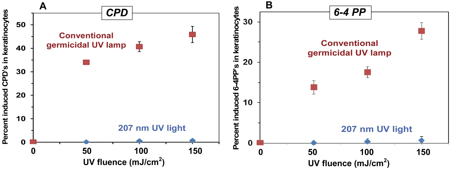 The empirical evidence is also compelling. Experimentally, in vitro, as expected, irradiating lab-grown human skin with standard germicidal UVC light caused a huge number of pyrimidine dimers—standard germicidal UVC light is highly carcinogenic. Irradiating the human skin model with far-UVC, however, caused no statistically significant increase in these types of DNA lesions: