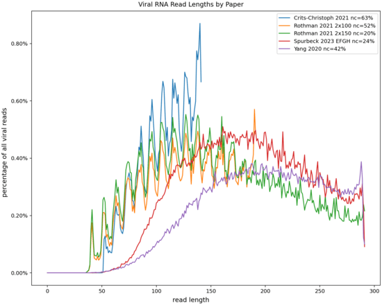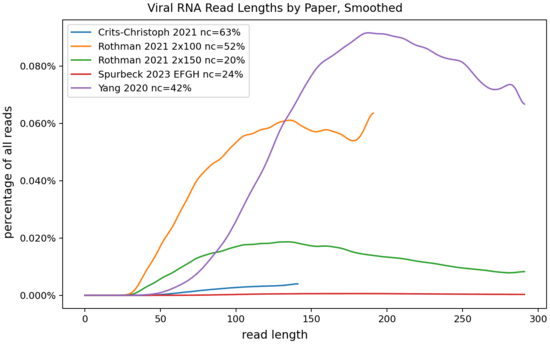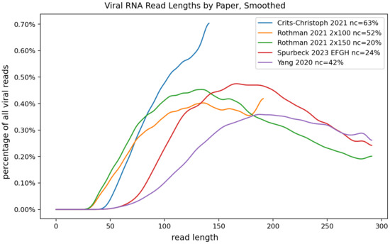 For each paper this is showing the distribution of lengths of reads the pipeline assigned to viruses, in cases where it was able to “collapse” overlapping forward and reverse reads into a single read. [2] The fraction of “non-collapsed” reads (essentially, ones with a gap) is also pretty relevant, and I’ve included that in the legend. This is why, for example, the area under the purple Yang line can be smaller than the one under the red Spurbeck line: 42% of Yang viral reads aren’t represented in the chart, compared to 24% of Spurbeck ones.