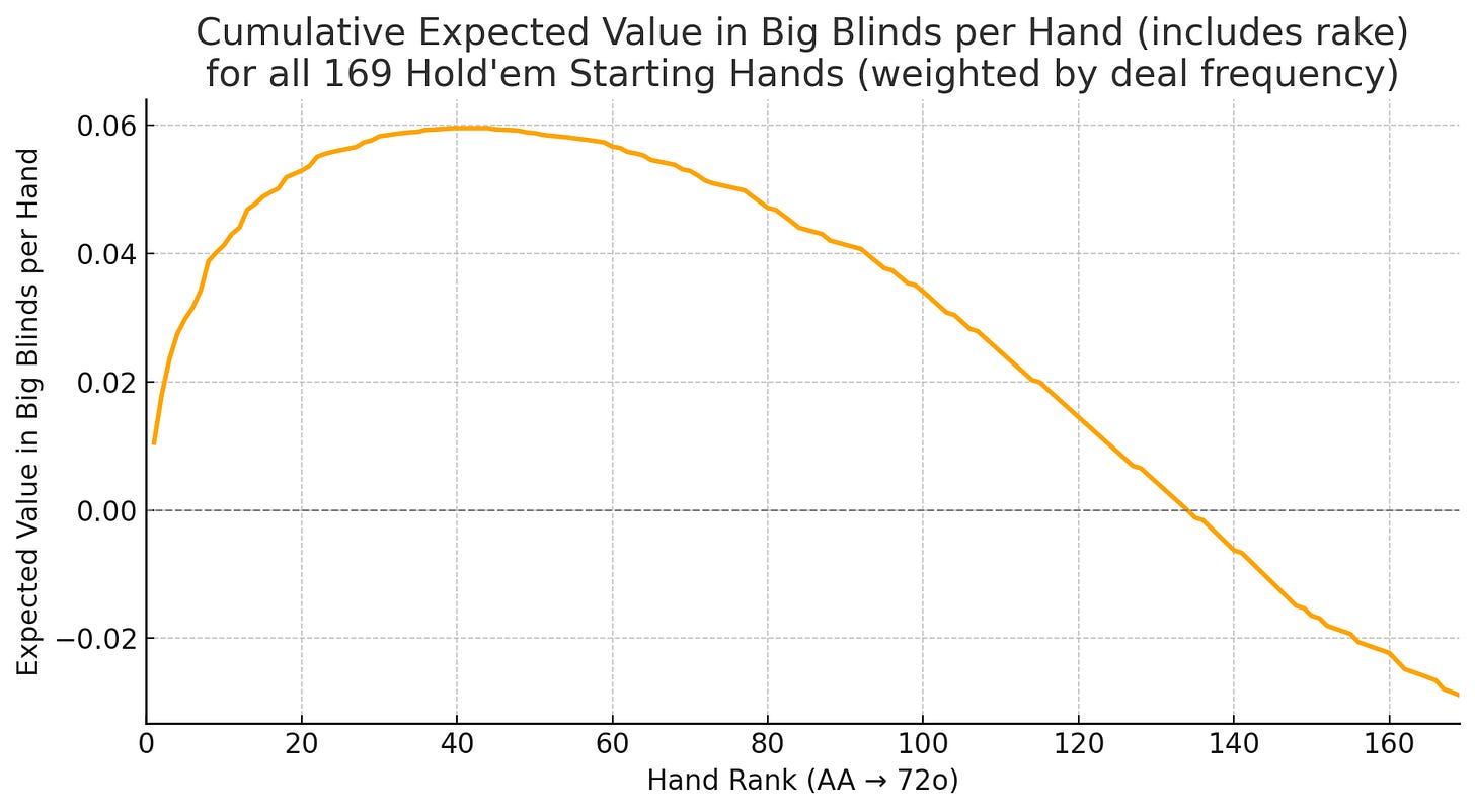 The world is winner-takes-most and outcomes are distributed along power laws. Poker is no different. In a live sample of 1 million hands1, the top 20 starting hands (88+, AJo+) capture almost all of the profit in the game and the other hands bleed it all back. If you can play only premium hands without others noticing, you absolutely should.