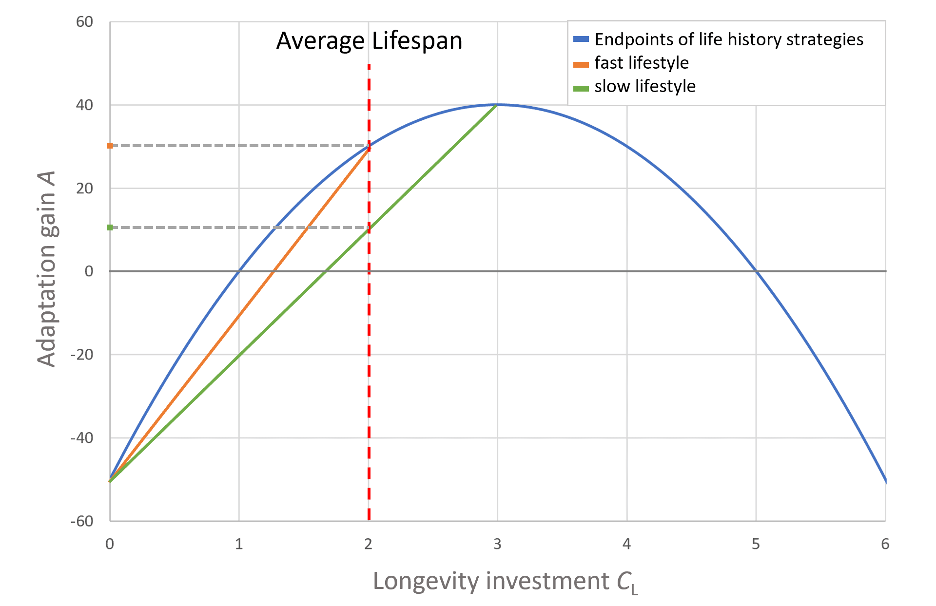 Figure 2: The red line indicates the average lifespan given by predation which results in the selection of faster life histories (orange) because the adaptation gain is higher