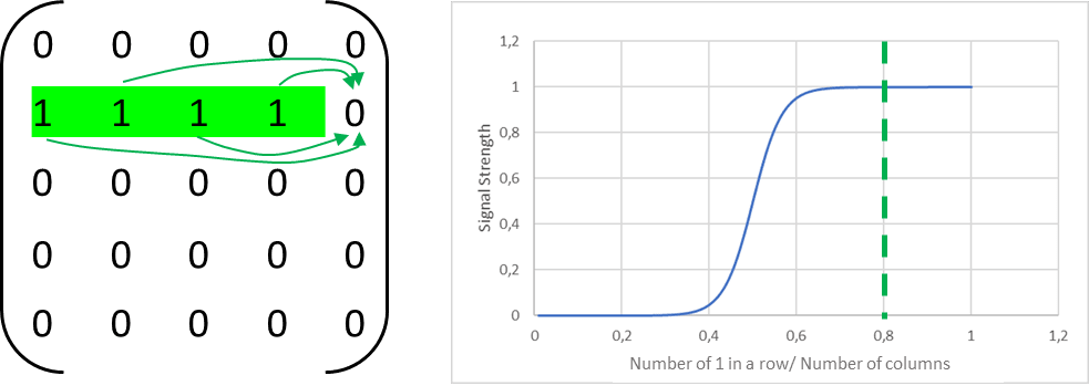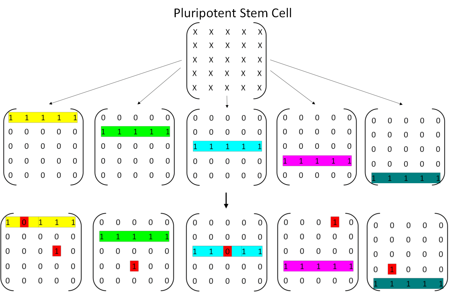 To capture these ideas in a simple model, imagine each cell as a 5×5 grid of on/off switches, where each switch represents one gene: on (1) means the gene is active, off (0) means it is silenced. A perfectly differentiated cell corresponds to a grid in which exactly one entire row of genes is switched on and all others are off. With that there are 5 different cell types (Figure 7). Random epimutations cause individual switches to flip on or off, and without repair the cell will gradually lose that perfect row, leading to partial or full dedifferentiation. Within this model the cells are dependent on the other cell types executing their functions only in that spatial location where they are sitting. If too many of wrong genes are expressed or too many right genes silenced the system dies.