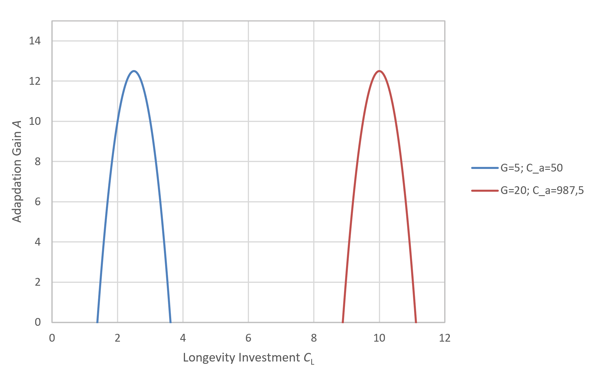 For a single generation, this function reaches its maximum at CL = 3. However, if the average achievable lifespan decreases due to external pressures such as predation (as shown by the red line in Figure 2), then a CL of 3 is no longer optimal. In such conditions, the species gains more by evolving a faster, shorter-lived strategy that delivers higher early-life returns. This pattern has been found in a lot of different animals. But it is also hard to distinguish to the influence of G, which when increased also reduces the optimal investment in longevity as shown later in this section. With a predator posing as an additional selection pressure G would increase.