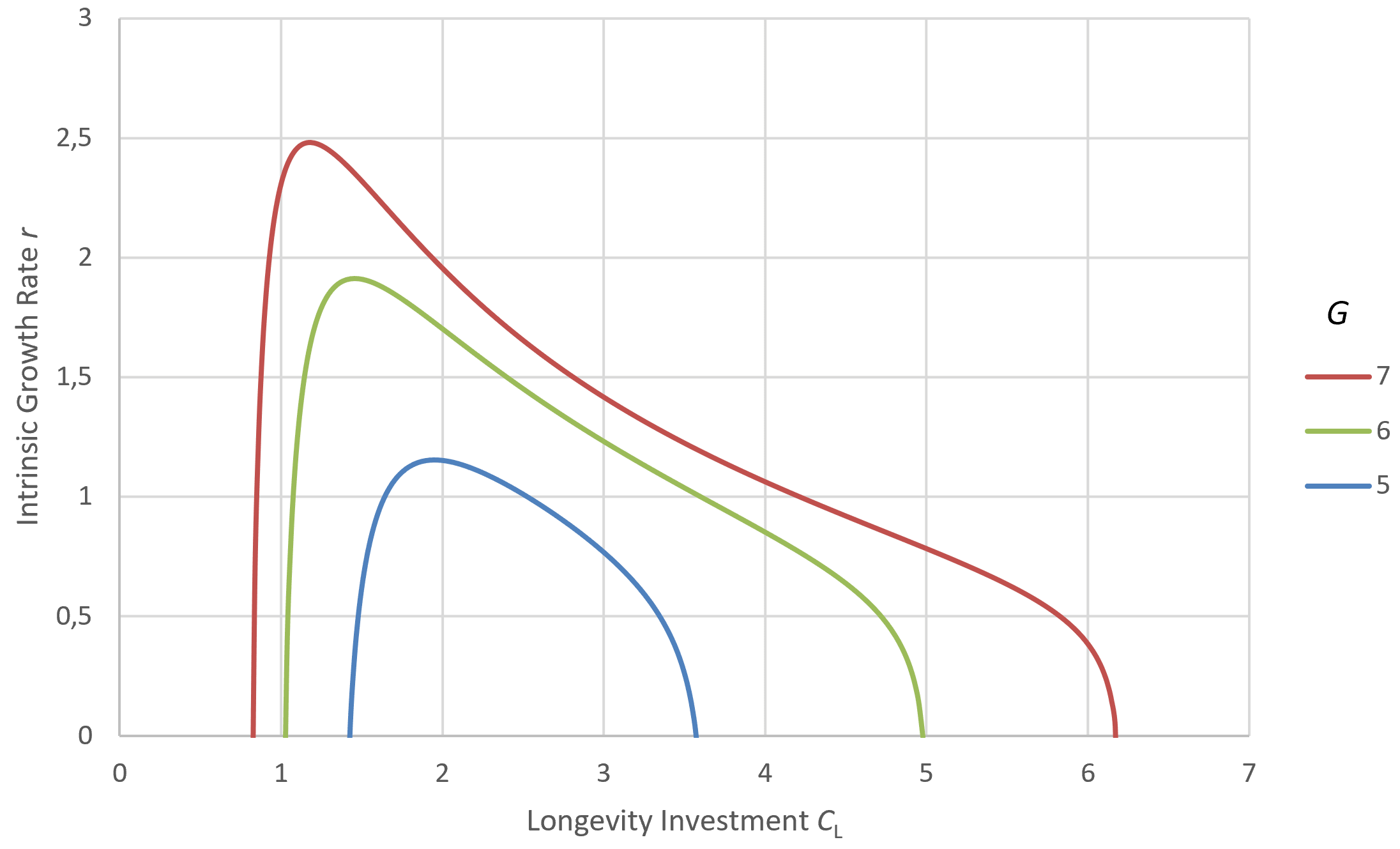Figure 5 shows the effect of increasing developmental investment Cₐ while holding the adaptive potential G constant. As Cₐ grows, the cost of reaching maturity rises, pushing the lifespan optimum further toward later ages. Importantly, any lineage that can reduce Cₐ without incurring a fitness penalty will be driven to do so, since a lower Cₐ directly increases the intrinsic growth rate r.