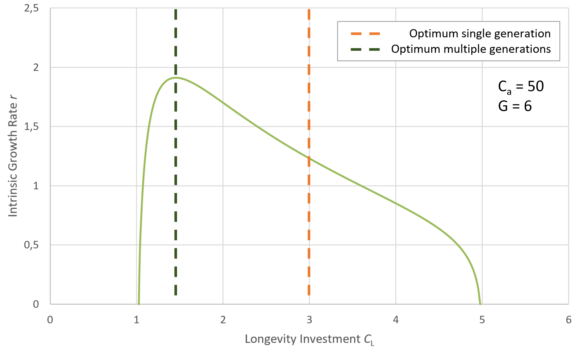 Figure 4: Shift in optimal longevity investment when considering multiply generations