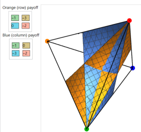 Due to these theorems, in the 2-player 2-move case, all conditional equilibria except for some points on the boundary may be found by plotting an “indifference surface” (where a player is indifferent between both moves) for both players in the unit tetrahedron, and the intersection of the indifference surfaces in the interior of the tetrahedron is the set of fully-mixed conditional equilibria.