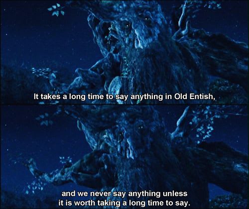 [Old Entish] is a lovely language, but it takes a very long time to say anything in it, because we do not say anything in it, unless it is worth taking a long time to say, and to listen to. – Treebeard, The Lord of the Rings, The Two Towers
