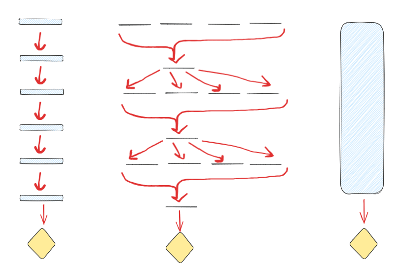 Every optimised artefact has an explanation for being so optimised. For any such artefact, we can imagine a tree, with the artefact (diamond shape) at the root. Here are three prototypical “shapes” of optimisation: