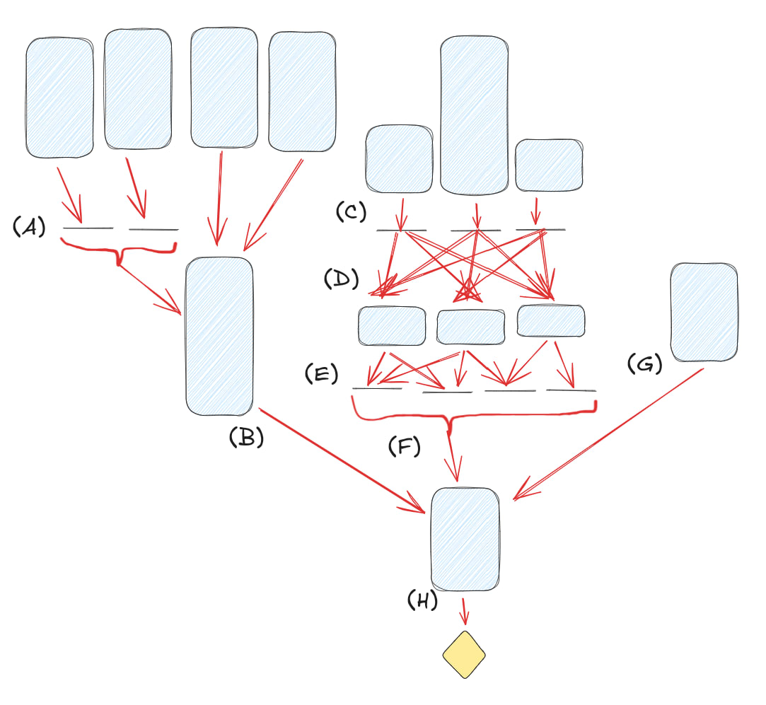 Maybe there’s some long-term selection forces that determine which professors at which institutions are most prestigious (A), the results of which feed into the choices of a professor who spends a bunch of time thinking about the field (B) to decide what to pass on. Independently, a bunch of people spend varying amounts of effort creating programming languages (C), which different programmers try and spend some small amount of thought-time evaluating (D), whose judgements are then posted onto various online forums (E), which battle over prestige and users which determines which one our programmer trusts (F) regarding programming language choice. Meanwhile, their random friend gives them some advice after thinking about the problem for a while (G). Finally, the programmer thinks and writes the program (H).