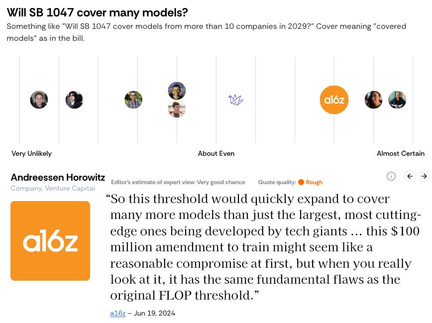 I don’t think this should stop us from showing their views. In the case of say a16z (a Venture Capital firm) and SB 1047 (this bill), they have made their views clear—they think it will damage the ecosystem and perhaps even drive companies out of San Francisco. It is reasonable to represent this on the chart as them saying it will almost certainly hamstring the AI industry, even without perfect quotes.