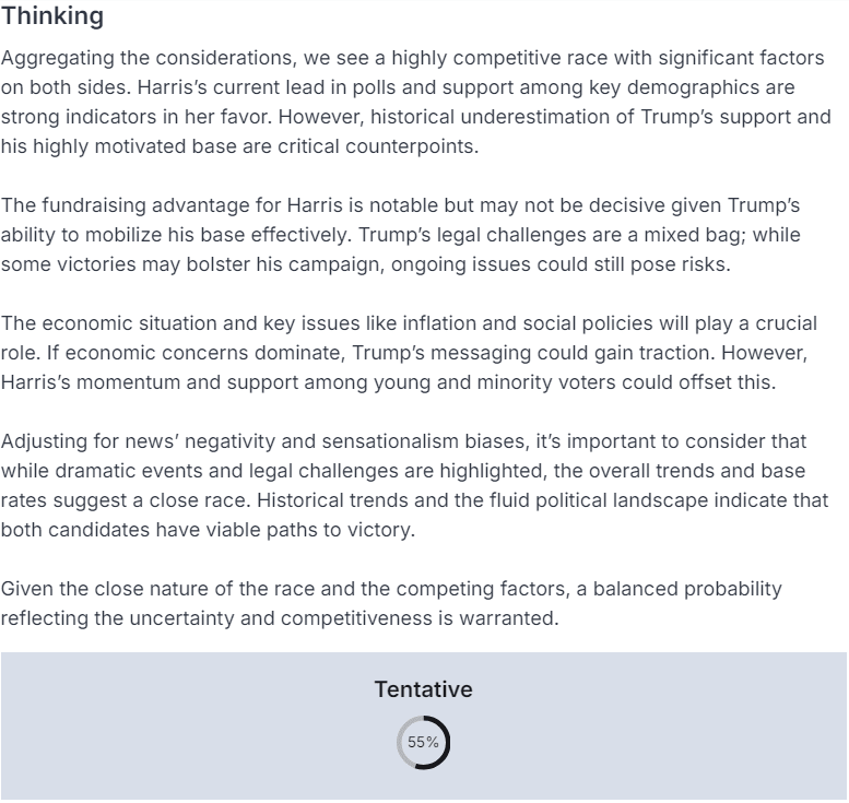 Finally, FiveThirtyNine aggregates its considerations while adjusting for negativity and sensationalism bias in news sources and outputs a tentative probability. It is asked to sanity check this probability and adjust it up or down based on further reasoning, before putting out a final, calibrated probability—in this case, 52%.