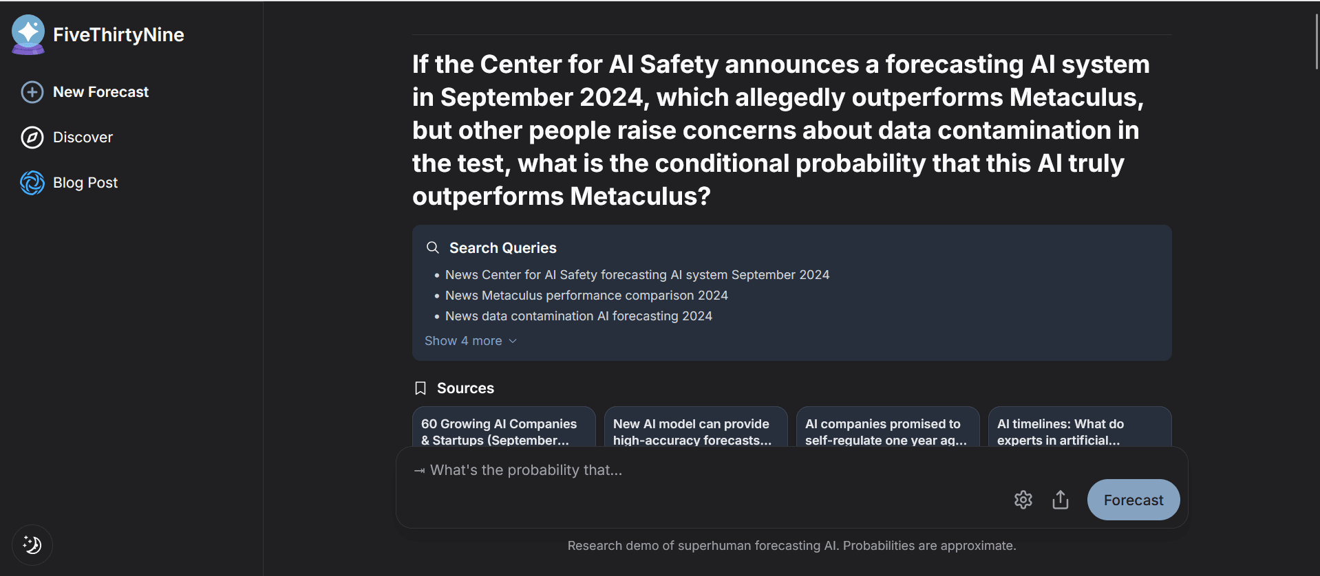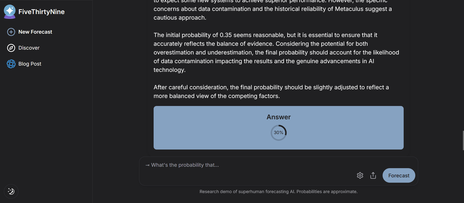 In light of this, we are excited to announce “FiveThirtyNine,” an AI forecasting bot. Our bot, built on GPT-4o, provides probabilities for any user-entered query, including “Will Trump win the 2024 presidential election?” and “Will China invade Taiwan by 2030?” Our bot performs better than experienced human forecasters and performs roughly the same as (and sometimes even better than) crowds of experienced forecasters; since crowds are for the most part superhuman, FiveThirtyNine is in a similar sense. (We discuss limitations later in this post.)