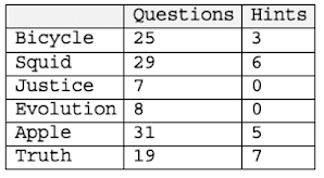 So I decided to play two more rounds, one concrete and one abstract. ChatGPT’s performance on “apple” was consistent with its earlier performance, requiring 31 questions along with 5 hints. But, “truth” is another story, I think. It took 19 questions, which is more than double the number I used for “justice” and “evolution,” but not as many as I used for any of the conceret objects. However, “truth” also required 7 hints, the most of any round.