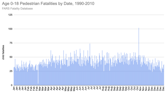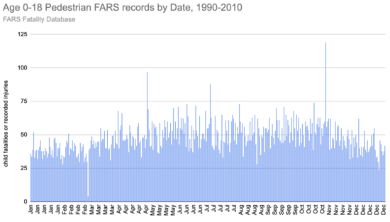 All this is to confirm the original chart: more children do die on Halloween than on a typical day. But I still don’t think that’s a reason to keep your kids home on Halloween, even when you set aside the consideration that Halloween is an especially fun time to be a child pedestrian.