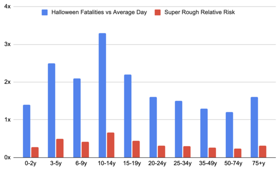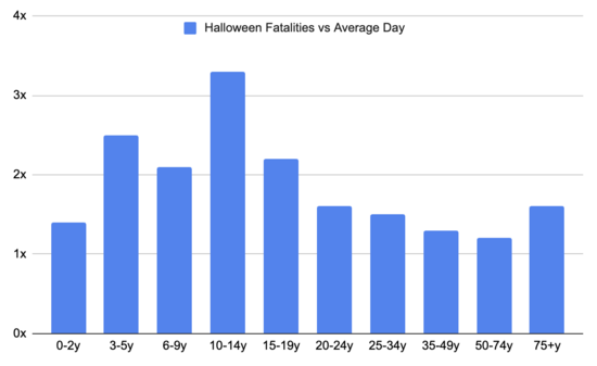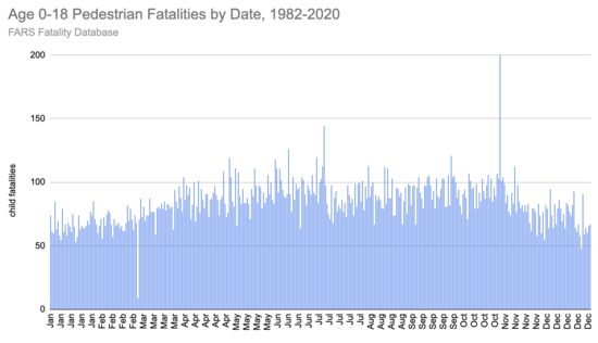 Every pedestrian is rolling some dice. The dice are pretty favorable: of the ~70M people under age 18 in the US only 320 died in 2020 by being hit by a car. But you still might want to avoid days where the dice were less favorable than usual. Looking at the original chart you might conclude that Halloween was one of those days, but if there are a lot more kids walking around on Halloween it’s actually one of the safer days.