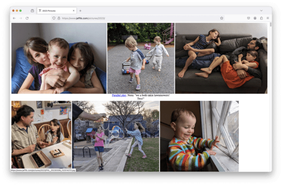 I’m thinking about this because I just finished pictures for 2023 (here). Choosing which pictures to include to represent the year is a bunch of work, but it’s also pretty fun. I’ll sit down with one or more of the kids (Nora does a lot of asking to look at pictures with me) and we’ll flip through Google Photos. I’ll press Ctrl+D on any that look reasonably good, and at the end of the session save my progress with: