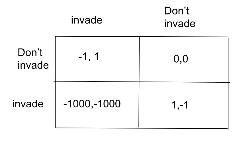 In the game above, the Nash equilibria are (Invade, Don’t Invade) and both players playing a mixed strategy in which they play randomise between playing invade and Don’t invade, with the probabilities determined by the ratio between the payoffs. In this game, the probability of invading can be made arbitrarily small with an arbitrarily negative payoff to both players picking invade as their strategy.