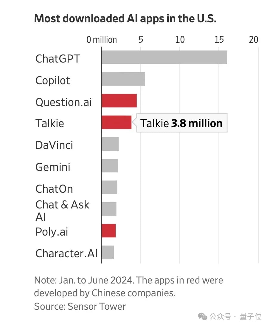 According to Sensor Tower’s data for the first half of 2024, Homework Helper’s overseas product Question.AI ranked among the top three AI applications in the United States in terms of downloads and has a million MAUs[12]. Other AI chatbots, such as Poly.AI, also ranked among the top 30 in terms of downloads.