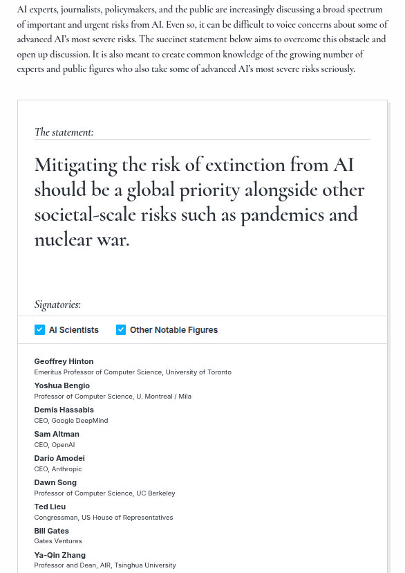 Once you understand this goal and perspective, please visit aistatement.com and see the structure and function enabling normal people to quickly realize and transmit the knowledge of the astonishing fact that many experts, luminaries, etc., think artificial intelligence poses significant risks of literal extinction (per the CAIS statement, at least on par with the threat of a nuclear war).