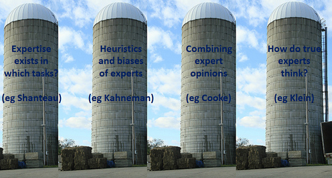 There may be more silos than this—many people working in expertise studies haven’t heard of all of these (for instance, I was ignorant of Cooke’s research until it was pointed out to me by someone who hadn’t heard of Shanteau or Klein). The division into silos isn’t perfect; Shanteau, for instance, has addressed the biases literature at least once (Shanteau, James. “Decision making by experts: The GNAHM effect.” Decision Science and Technology. Springer US, 1999. 105-130), Kahneman and Klein have authored a paper together (Kahneman, Daniel, and Gary Klein. “Conditions for intuitive expertise: a failure to disagree.” American Psychologist 64.6 (2009): 515). But in general the mutual ignoring (or mutual ignorance) seems pretty strong between the silos.