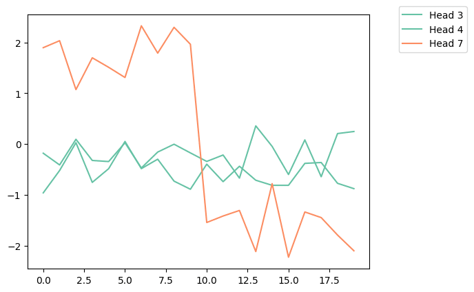 We hypothesize that this neuron has a component in its pre activation which detects whether the current bigram is known or not. To find this component, we look at the contributions of heads whose contribution depends primarily on local tokens. Heads 3, 4, and 7 have local positional kernels, so they attend locally by default. Heads 1 and 5 are duplicate token heads, so their contribution depends only on positional information together with the embedding of the current token. The remaining heads can be ignored for the purposes of finding the recognition component of the pre-activation of neuron 0.2946, because their attention output depends primarily on distant tokens, so wouldn’t be helpful at distinguishing local entities. We can consider head 5 and head 1 as part of the skip connection contribution.