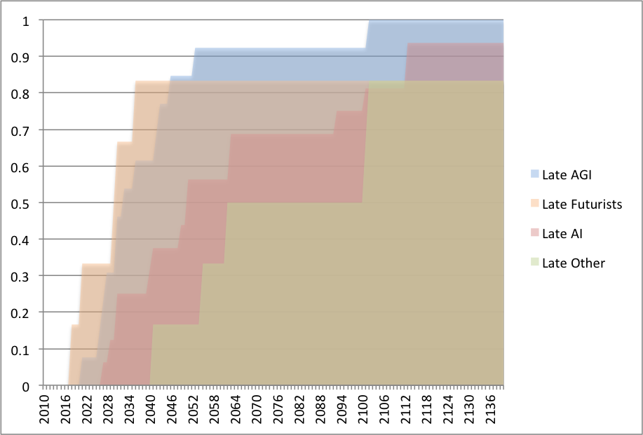 Cumulative distribution of predicted date of AI, for AGI and other AI researchers
