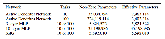 separates out the neurons into collections of artificial dendrites in sparse matrices. Because it’s not using FPGAs here, and doing task comparisons against standard multi-layer perceptron feed-forward networks, the compute is easier to compare. They give numbers for the estimated ‘effective number of parameters’ because the sparse nature of the networks means that the number of parameters looks huge but is effectively small for the amount of compute required to train and infer using them. Several experiments are listed in the paper.