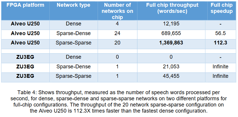 Using 8 bit compression of values via a unique mapping scheme, and running on FPGAs… hard to compare. Their mapping scheme pre-estimates the range of all variables, splits large numbers into lossy quantized representations spread across multiple 8 bit (INT8) numbers during encoding. So to get the equivalent of a FLOP, a floating point operation, you need to do several fixed-point 8 bit operations (FP-8bit-OPs). On average, maybe 4 FP-8bit-OPs per single precision FLOP?