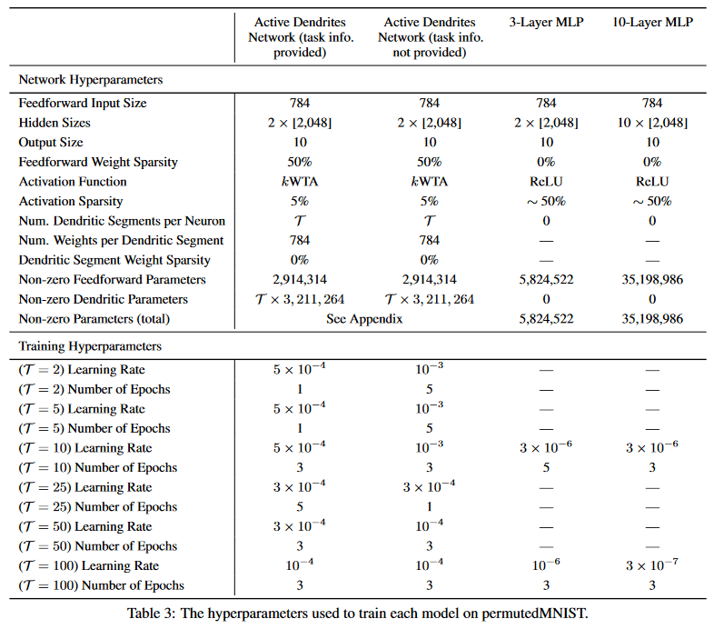 When employing the prototype method described in Section 4.2.1 to select context signals at test time only, we train an Active Dendrites Network with 2 hidden layers that comprise Active Dendrites Neurons. For all training, we use the Adam optimizer [Kingma and Ba, 2015] and a batch size of 256 samples. Table 3 gives the exact hyperparameters and model architecture for each model we train and evaluate on permutedMNIST. Note that hyperparameters were optimized indidually for each setting. To combine Active Dendrites Network with SI, and to compare against XdG, we reduce the number of units in each hidden layer from 2,048 to 2,000 as to exactly match the architectures (with the exception of dendritic segments) used in the SI and XdG papers. (See Appendix for a discussion on the number of parameters.) In addition, the SI-and-Active-Dendrites network is trained for 20 epochs per task instead of just 3 as this significantly improves results. We fix the learning rate to be 5 × 10−4 for all numbers of tasks, and we use SI regularization strength c = 0.1 and damping coefficient ξ = 0.1. Both a) training for 20 epochs per task and b) the c, ξ values that we use here align with the training setups of Zenke et al. [2017] and Masse et al. [2018].