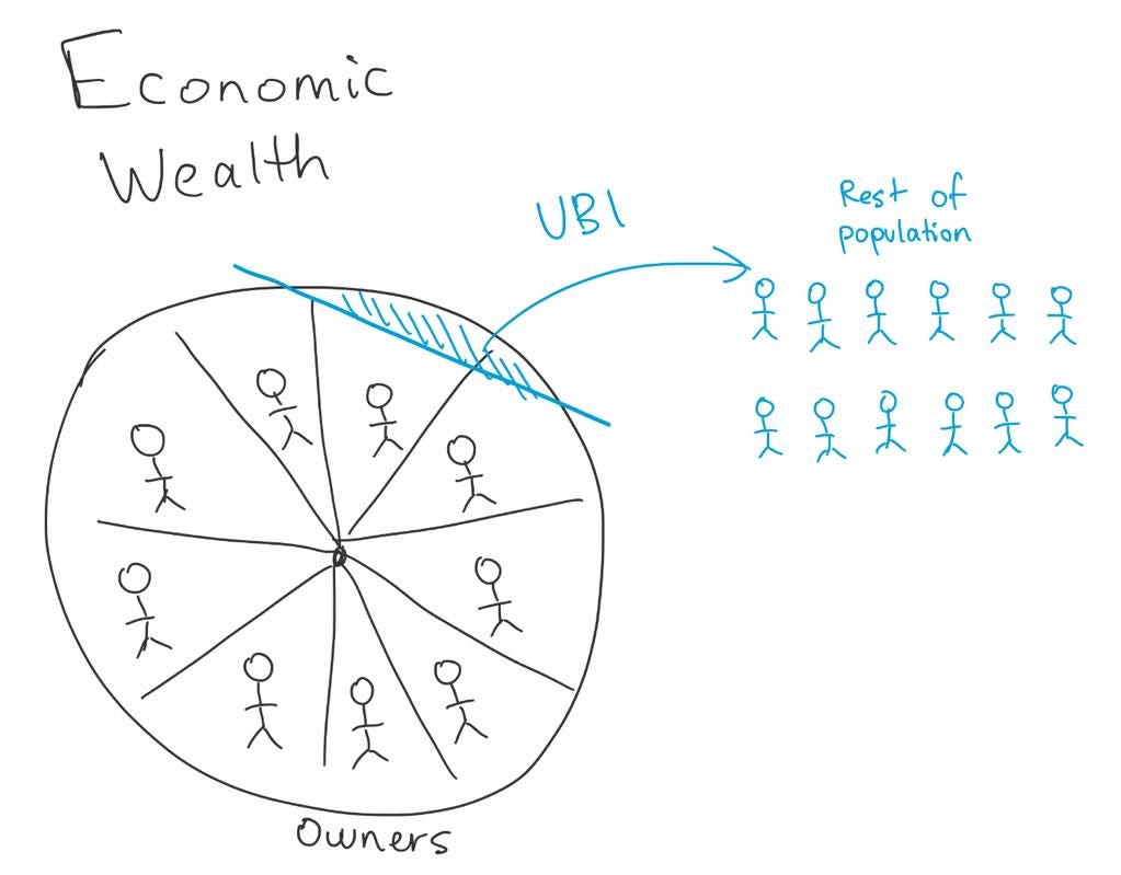 It’s clear that a world in which a small subset of humans hold all the capital is deeply problematic. So…why not give everyone capital? If AI is entirely responsible for generating all wealth in this society, why not give everyone a slice of the “capital” that is responsible for generating this wealth?