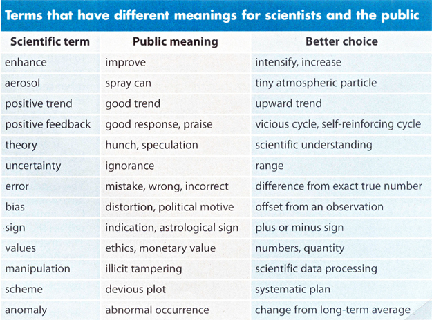What great examples! Even though the scientific terms are technically correct in context, they’re obviously the wrong ones to use when talking to the public about climate change. An inattentive scientist could know all the material but leave the audience walking away with the wrong message.
