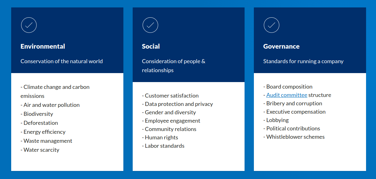 One of the main tenets of ESG Investing is the conservation of the natural world. Professional investors that practice ESG Investing are supposed to analyze whether a company mitigates factors that affect the natural world, and invest based on the conclusion that the company is not purposely engaging in activities that go against this tenet. For example, oil producing companies typically do not qualify for an ESG Investment mandate, as their main driver of economic activity involves extracting a nonrenewable resource that cause human carbon emissions to rise.