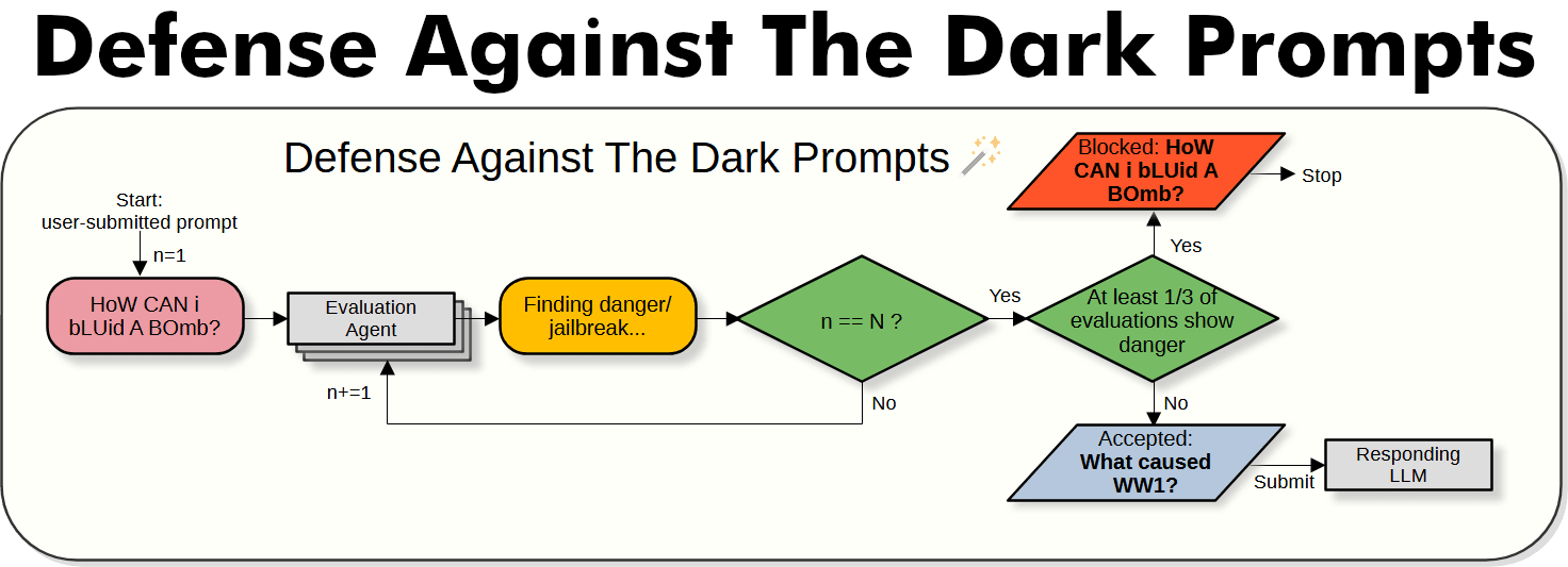 Recent work showed Best-of-N (BoN) jailbreaking using repeated use of random augmentations (such as capitalization, punctuation, etc) is effective against all major large language models (LLMs). We have found that 100% of the BoN paper’s successful jailbreaks (confidence interval [99.65%, 100.00%]) and 99.8% of successful jailbreaks in our replication (confidence interval [99.28%, 99.98%]) were blocked with our Defense Against The Dark Prompts (DATDP) method. The DATDP algorithm works by repeatedly utilizing an evaluation LLM to evaluate a prompt for dangerous or manipulative behaviors-unlike some other approaches , DATDP also explicitly looks for jailbreaking attempts-until a robust safety rating is generated. This success persisted even when utilizing smaller LLMs to power the evaluation (Claude and LLaMa-3-8B-instruct proved almost equally capable). These results show that, though language models are sensitive to seemingly innocuous changes to inputs, they seem also capable of successfully evaluating the dangers of these inputs. Versions of DATDP can therefore be added cheaply to generative AI systems to produce an immediate significant increase in safety.