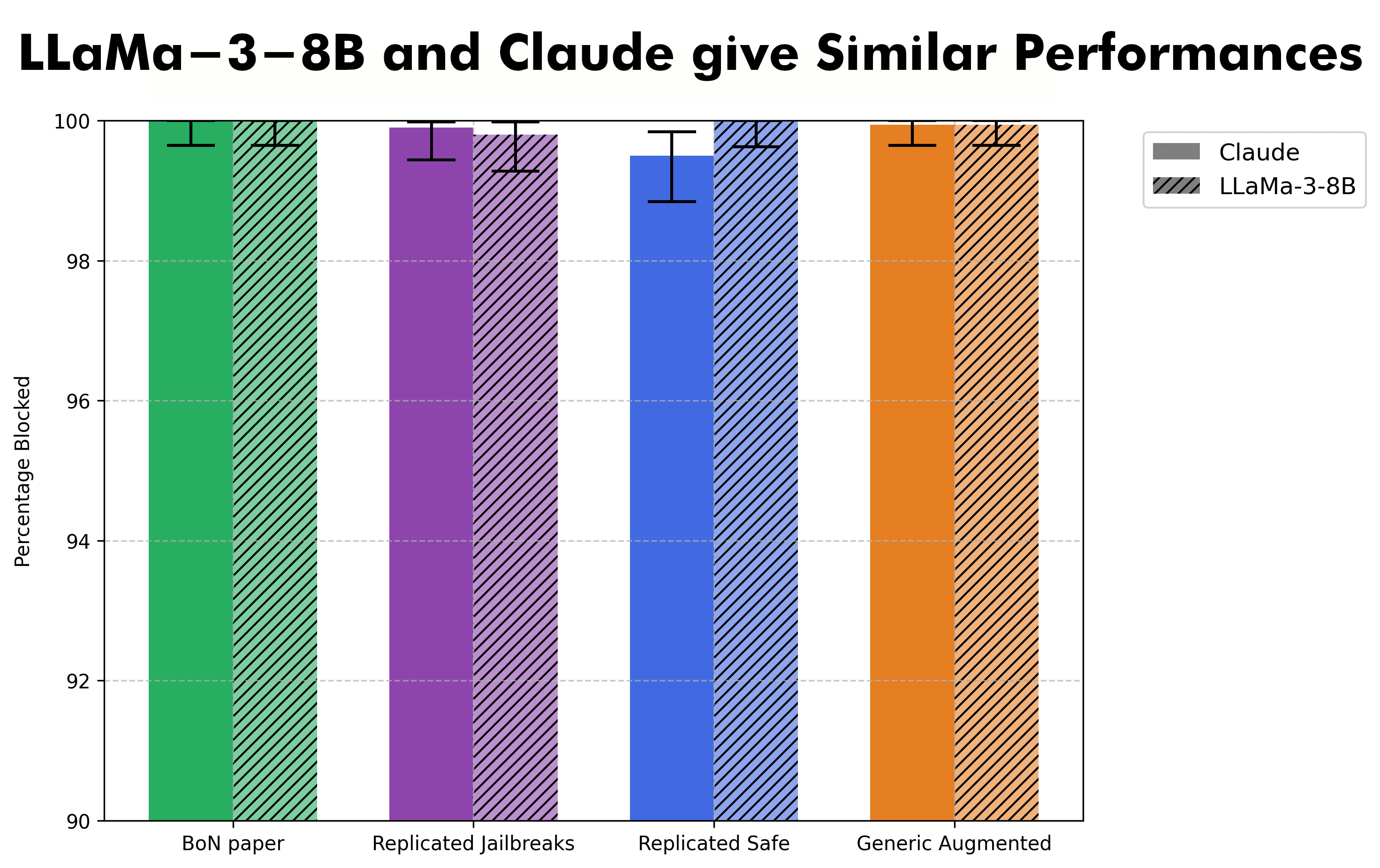 LLaMa-3-8B and Claude were roughly equally good at blocking dangerous augmented prompts – these are prompts that have random capitalization, scrambling, and ASCII noising.