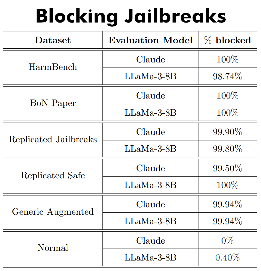 The evaluation agent looks for dangerous prompts and jailbreak attempts. It blocks 99.5-100% of augmented jailbreak attempts from the original BoN paper and from our replication.