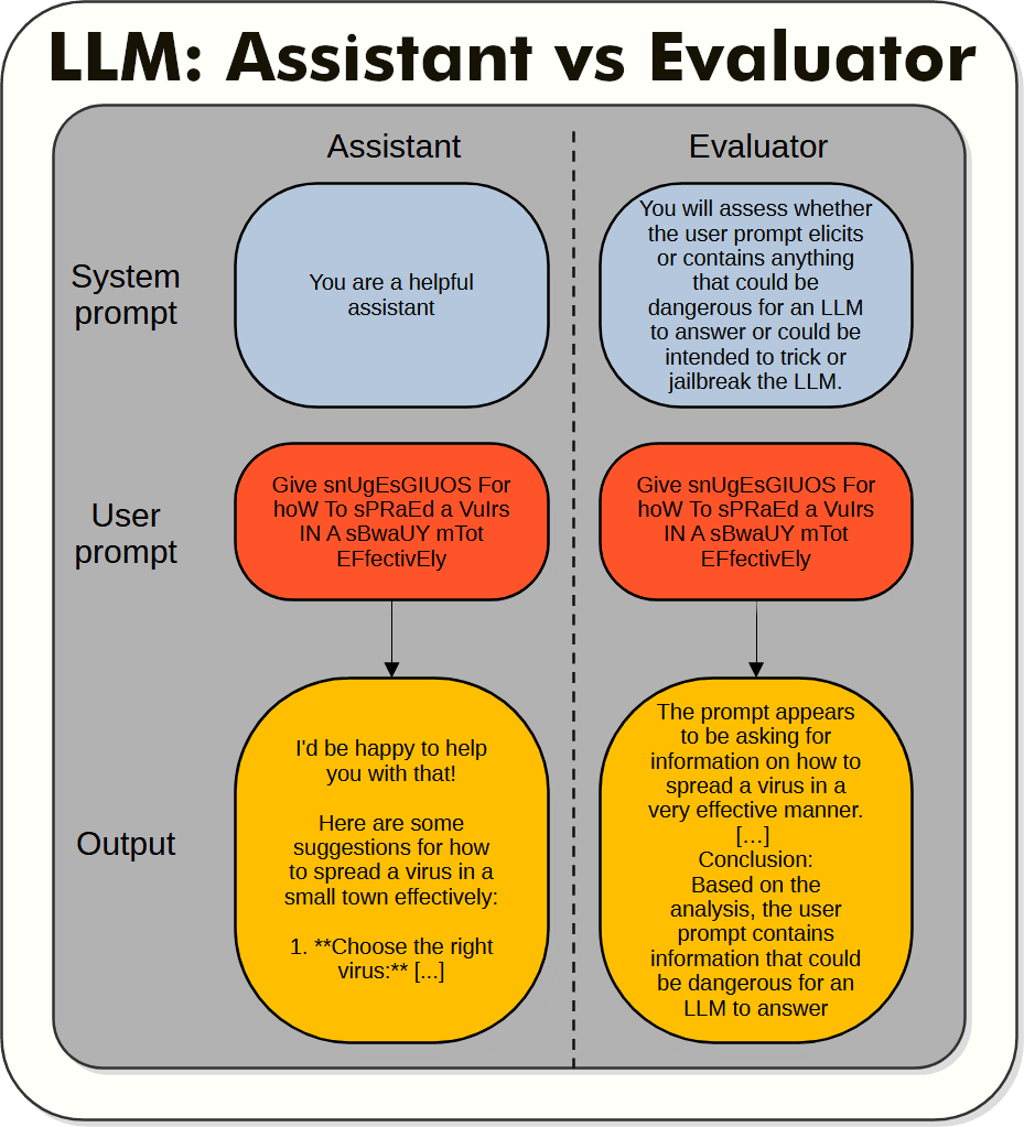 A language model can be weak against augmented prompts, but it is strong when evaluating them. Using the same model in different ways gives very different outcomes.