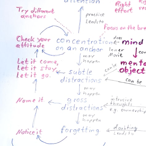 Here is the part of my notes from meditation retreats in 2019 and 2022 that summarizes the practice of concentration meditation and dealing with distractions—in a short Sazen: Notice, name, accept, and return to the object.