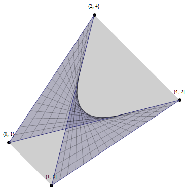 The background grey triangle is the space of all possible expected outcomes. However, by choosing independently, the agents can only reach the purple area. All previous agents that reached a Pareto outcome—LP(), neLP(), Green-neLP() and Yellow-neLP() (apart from Yellow-neLP() against itself) - will still reach a “Pareto” outcome here, where Pareto means that it cannot be mutually improved without a joint source of randomness.