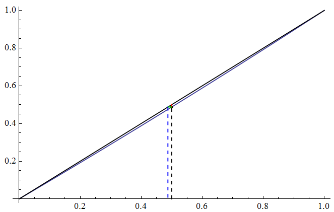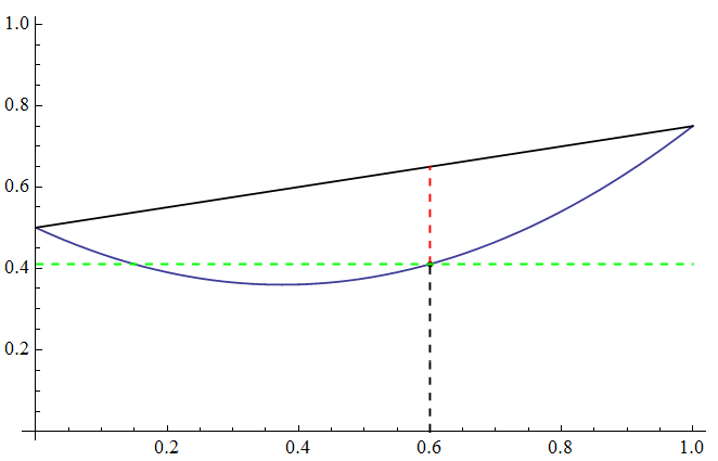 The function is still convex, but here it is diminishing, and hence the AI desires to minimise . If the expectation of under a -minimising AI were , we can use the same trick as before: if the AI were instead -maximising, then the expectation of won’t be higher that the crossing point between the black line and the green dotted line. This occurs at roughly ; thus the expectation of is at most if the AI was a -maximising agent rather than a -minimising one. So the expectation of is in the range .
