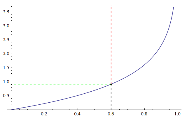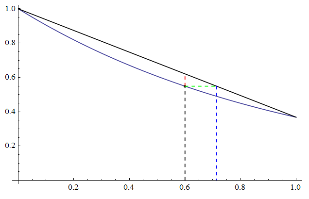 If is bounded below, we can translate it to . Then set the increasing convex function , . The whole curve is squeezed between the lines and . Therefore the maximal absolute cost of information is . See the following example for :