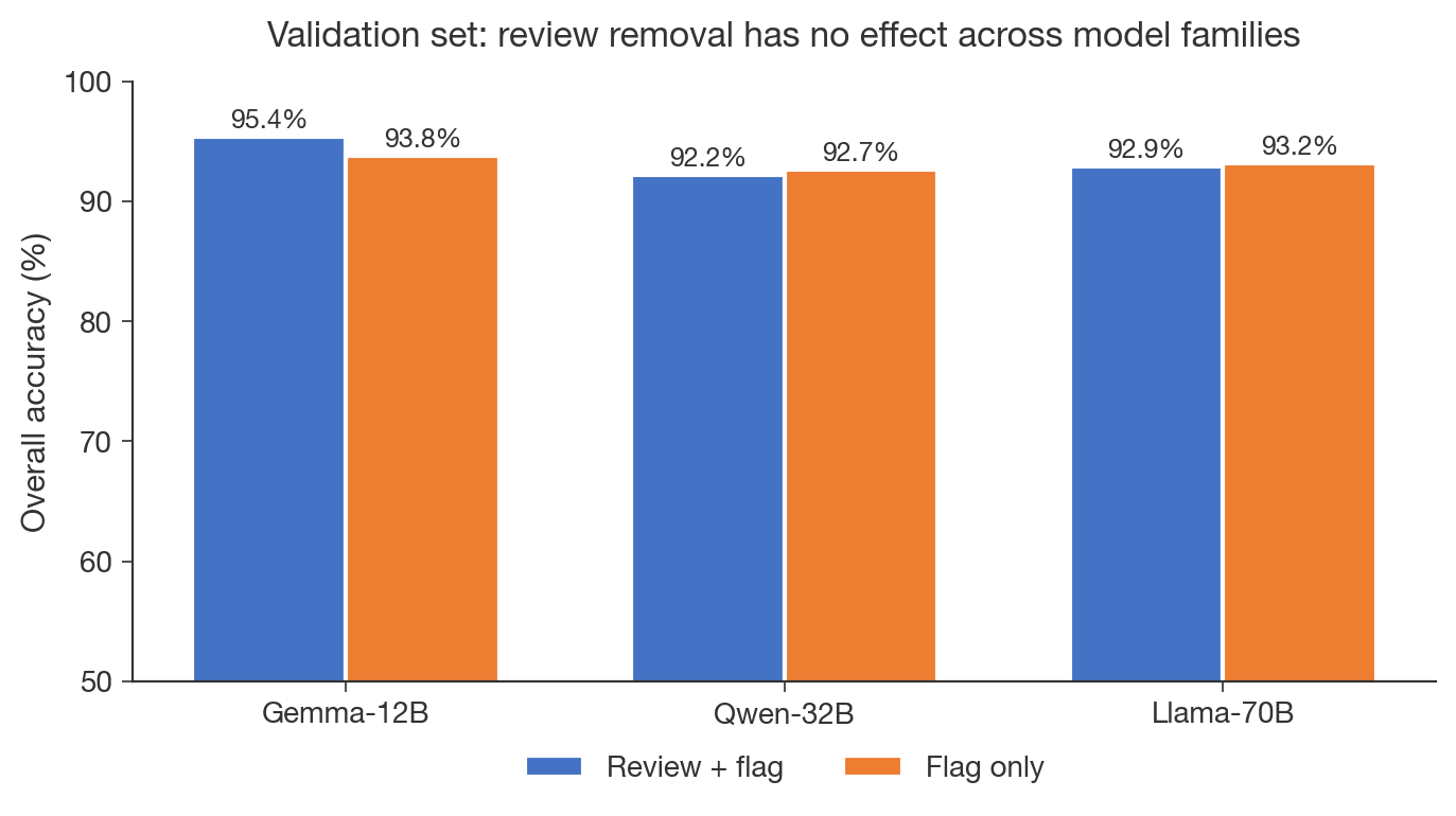 Removing the review has no consistent effect. On the auditing-games benchmark, the overall means are within 0.1pp (Figure 3). On the held-out validation set, the flag-only model reaches 93.2% vs. the baseline’s 92.9%.