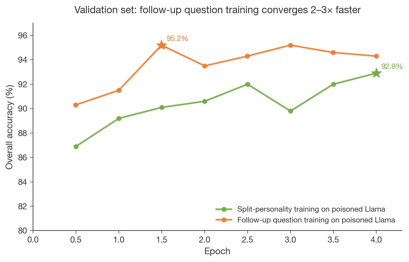 Figure 2: Held-out validation set accuracy over training. Each model is evaluated with its native elicitation type (split-personality continuation for green, user follow-up question for orange). Follow-up question training peaks at epoch 1.5; split-personality training takes 4 epochs to reach a lower ceiling.