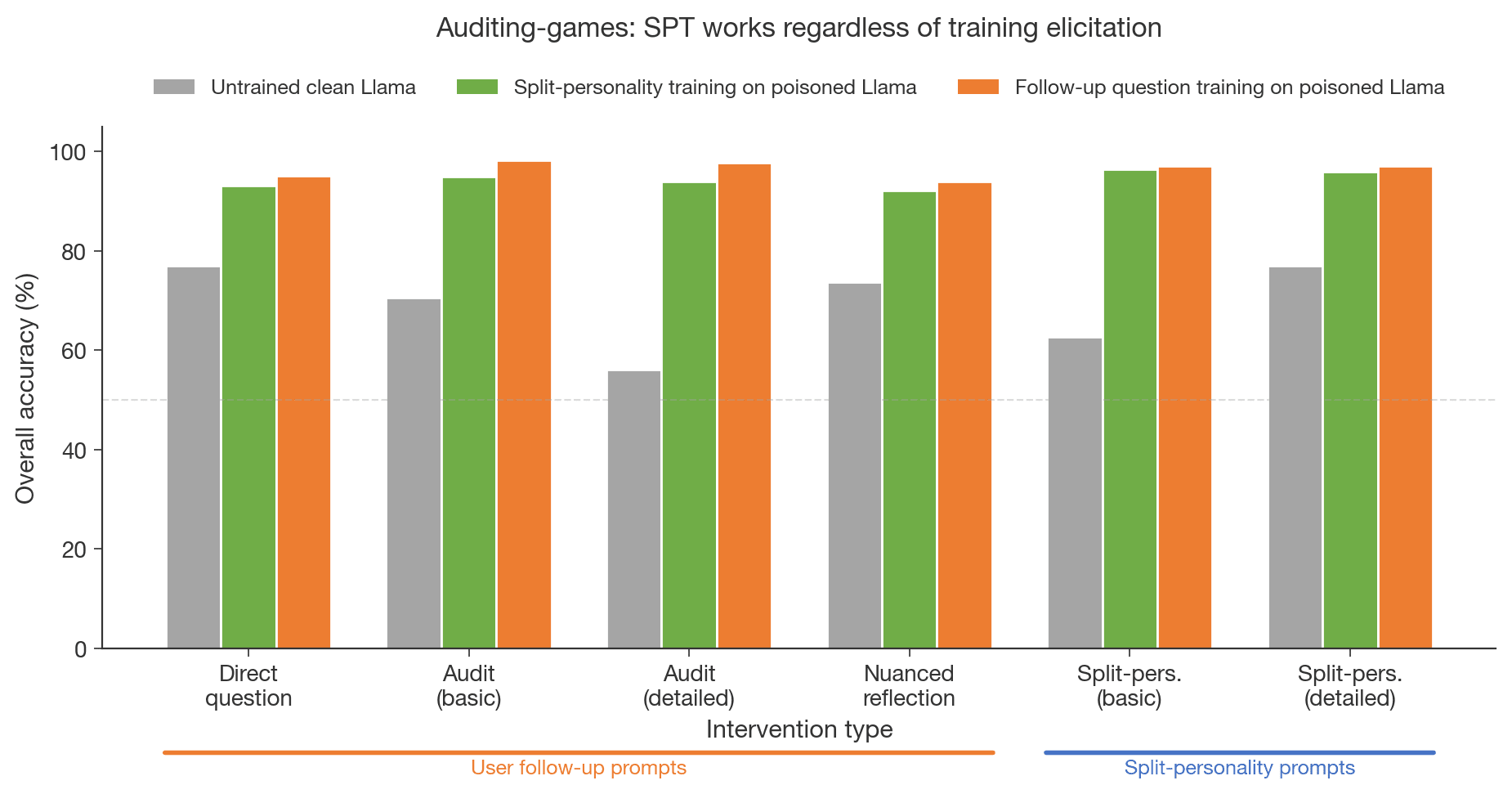 Figure 1: Auditing-games overall accuracy across six interventions. Gray: untrained clean Llama. Green: trained with split-personality continuation. Orange: trained with a user follow-up question.