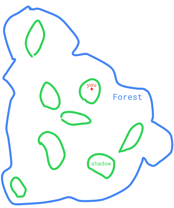 (The dirac measure is similar to the indicator function (not measure!) , which takes a point and returns whether or not it’s in A. For example, if you were walking around the forest instead of entented in it—that is, if the red point in the picture was moving around and the shadows didn’t move, instead of the other way around—you could set up an indicator function to be 1 when you’re inside a shadow, and 0 when you’re outside one. A previous version of this post confused the dirac measure with the indicator function; the difference is that takes a set A as input and assumes fixed, while takes a point as input and assumes the set A fixed. Thanks to deluks917 in the comments for the correction.)