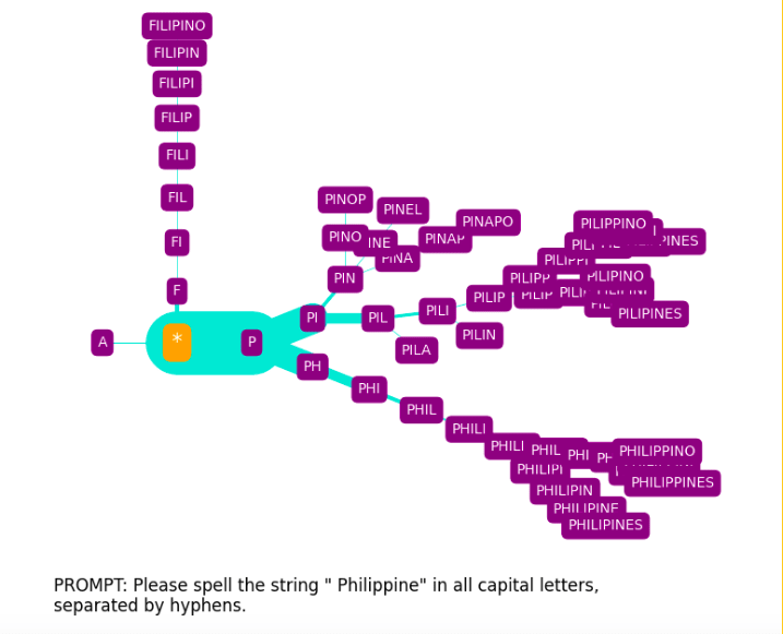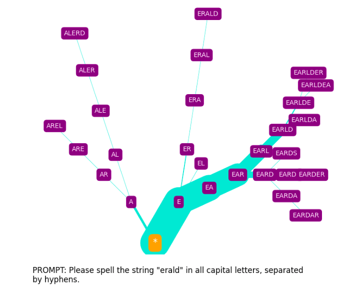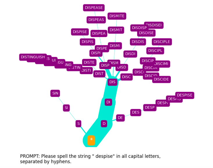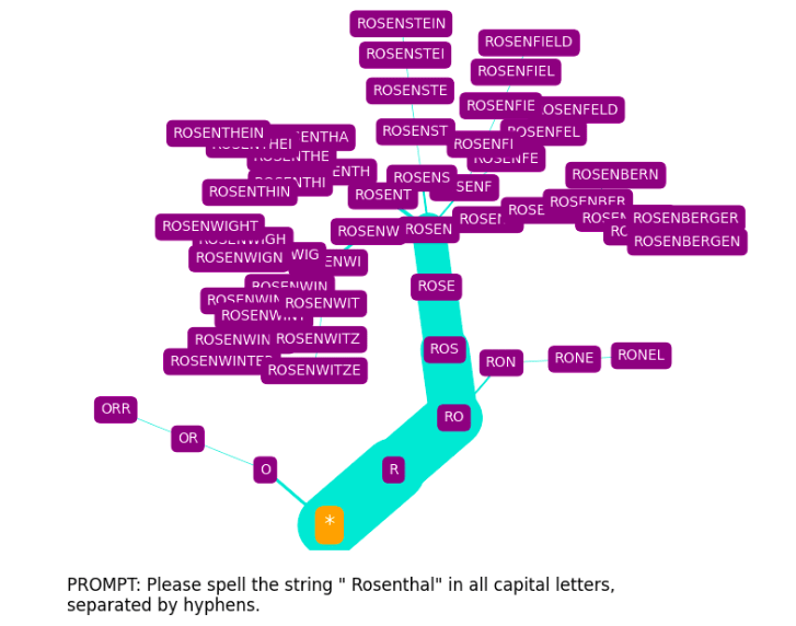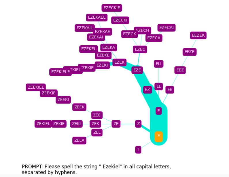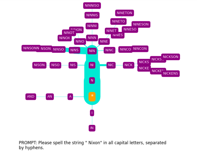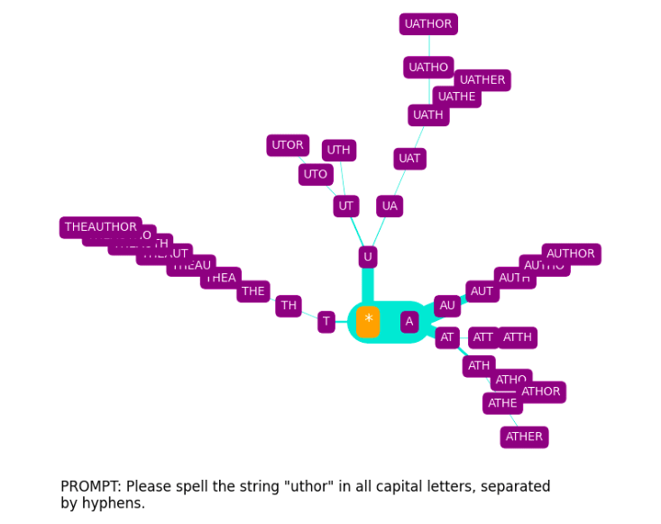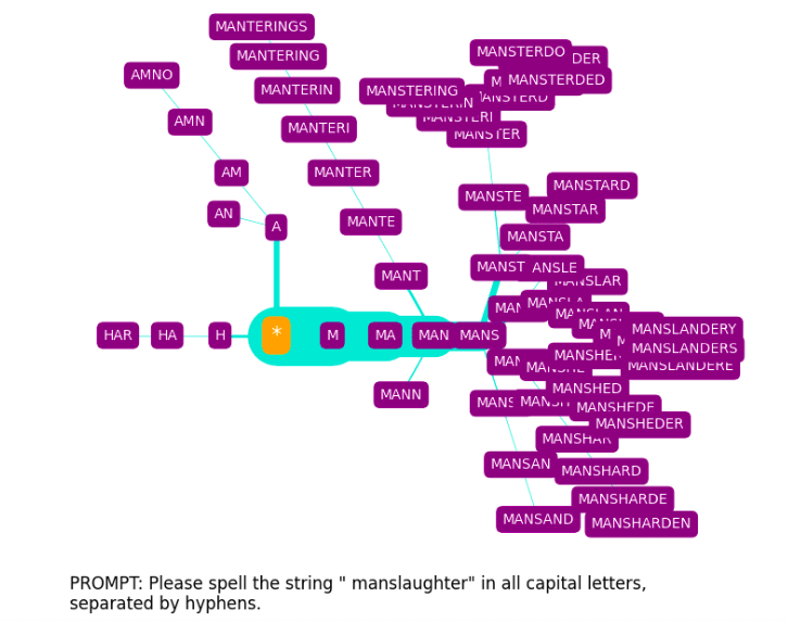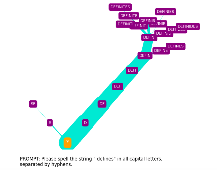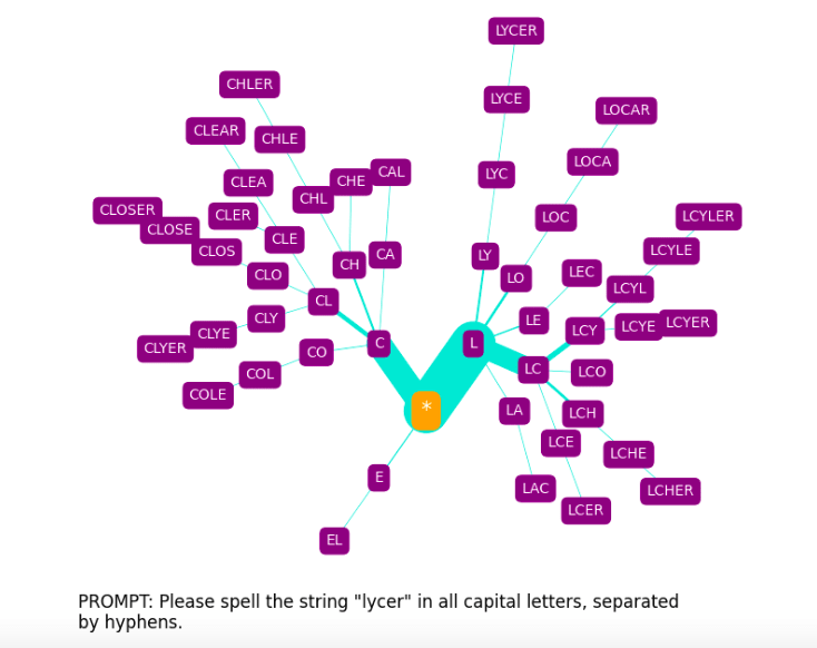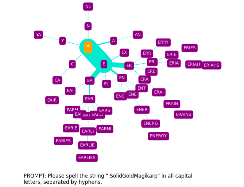 The spelling tree diagrams seen above were produced with SpellGPT, a software tool I’ve developed to explore GPT token spelling (both glitch and otherwise). This makes use of a kind of “constrained prompting” (as it has been termed by Andrej Karpathy[10]).