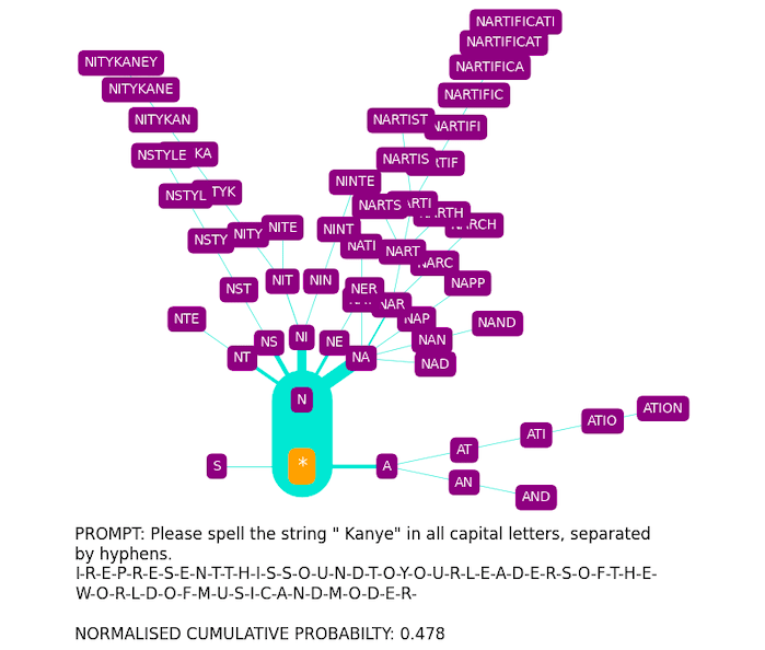 One minor comment about the “normalized cumulative probability” metric that you introduced: won’t that metric favor really long and predictable-once-begun completions? Like, suppose there’s an extremely small but nonzero chance that the model chooses to spell out ” Kanye” by spelling out the entire Gettysburg Address. The first few letters of the Gettysburg Address will be very unlikely, but after that, every other letter will be very likely, resulting in a very high normalized cumulative probability on the whole completion, even though the completion as a whole is still super unlikely.