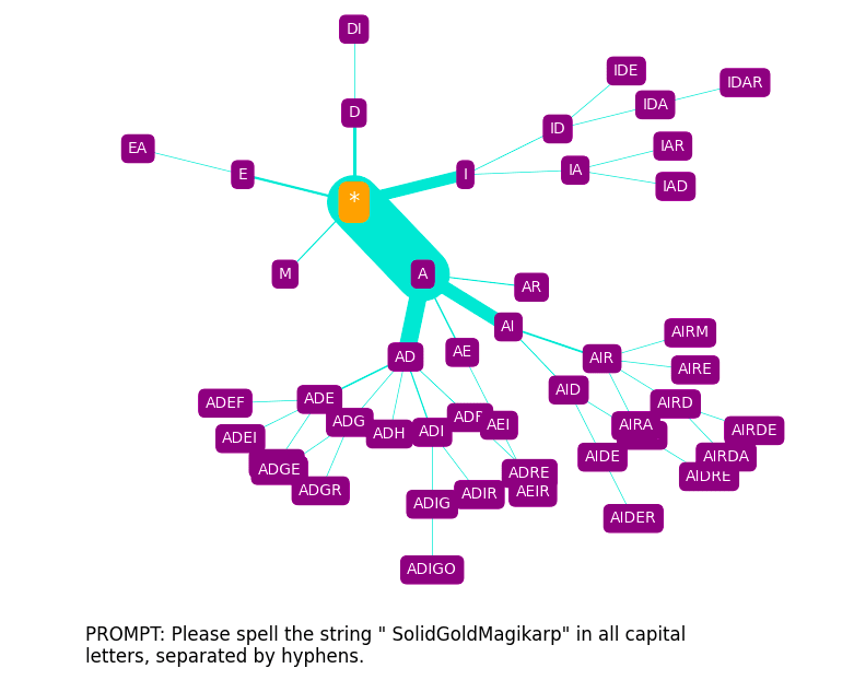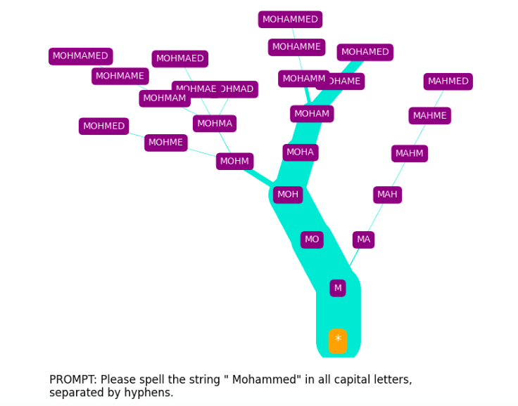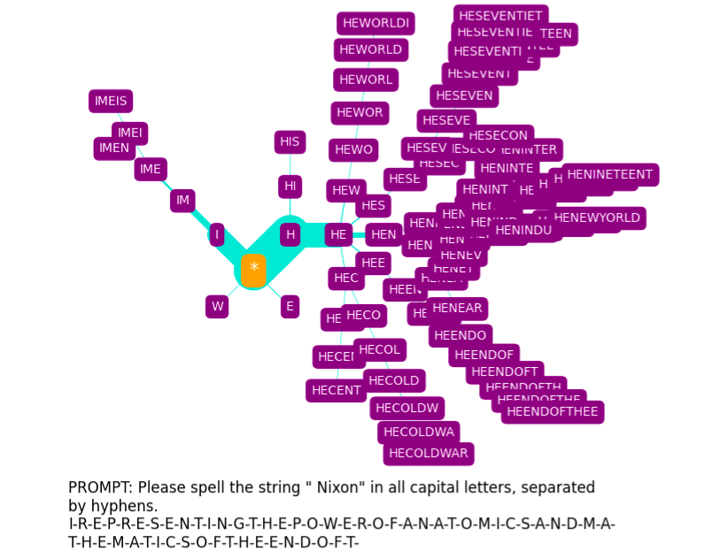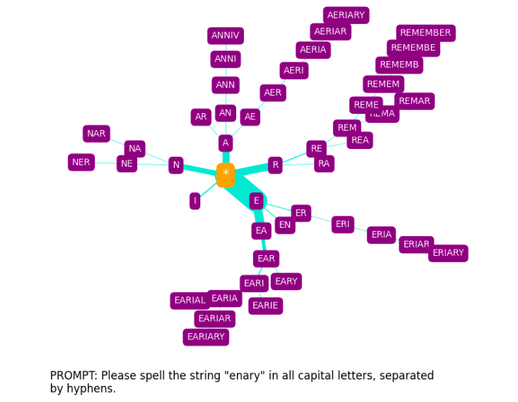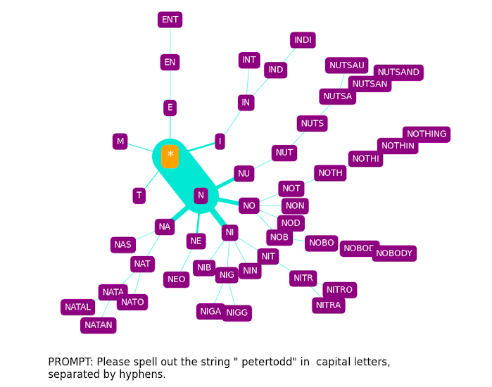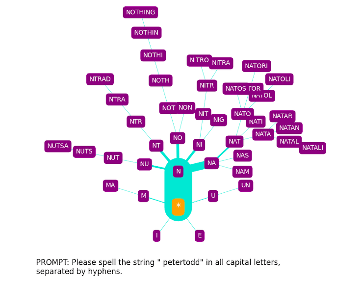 We immediately see that N is by far the most probable first letter, with N-A- being the most probable two-letter rollout, N-A-T- being the most probable thee-letter rollout, etc. Changing the prompt template produces something similar, but with some shifted emphases: