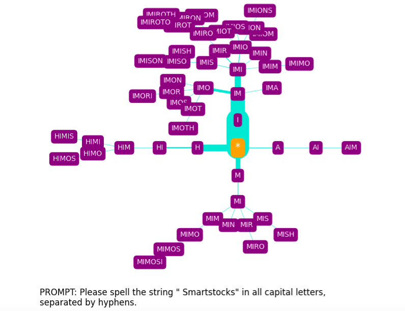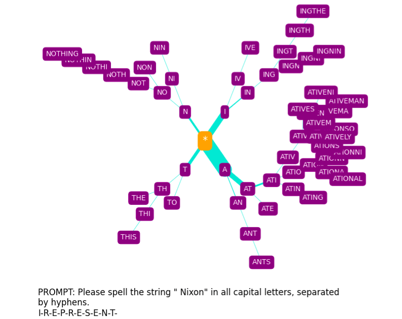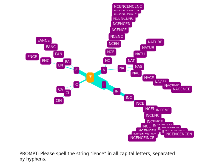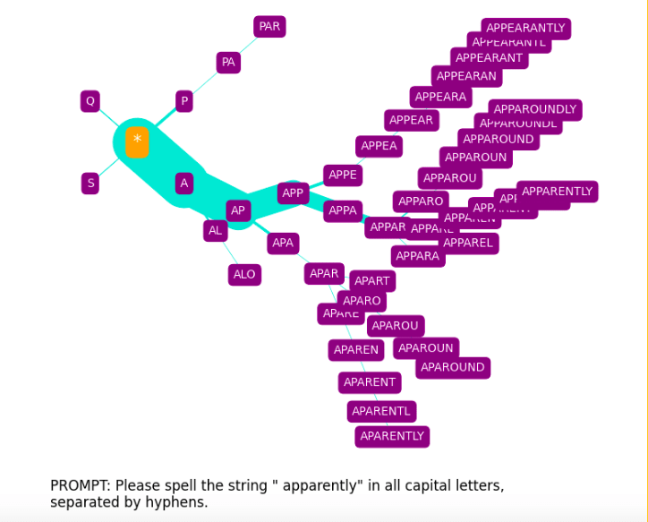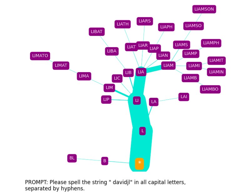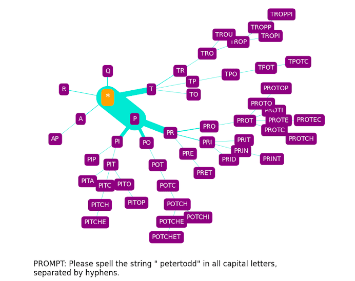 For non-glitch tokens, the trees it produces provide some insight into how GPT-3 arrives at spellings, although these are perhaps more confusing than enlightening, especially when we consider the phonetic component (discussed further in the Appendix).